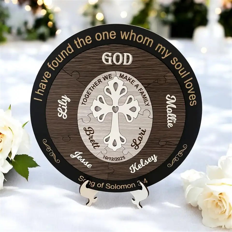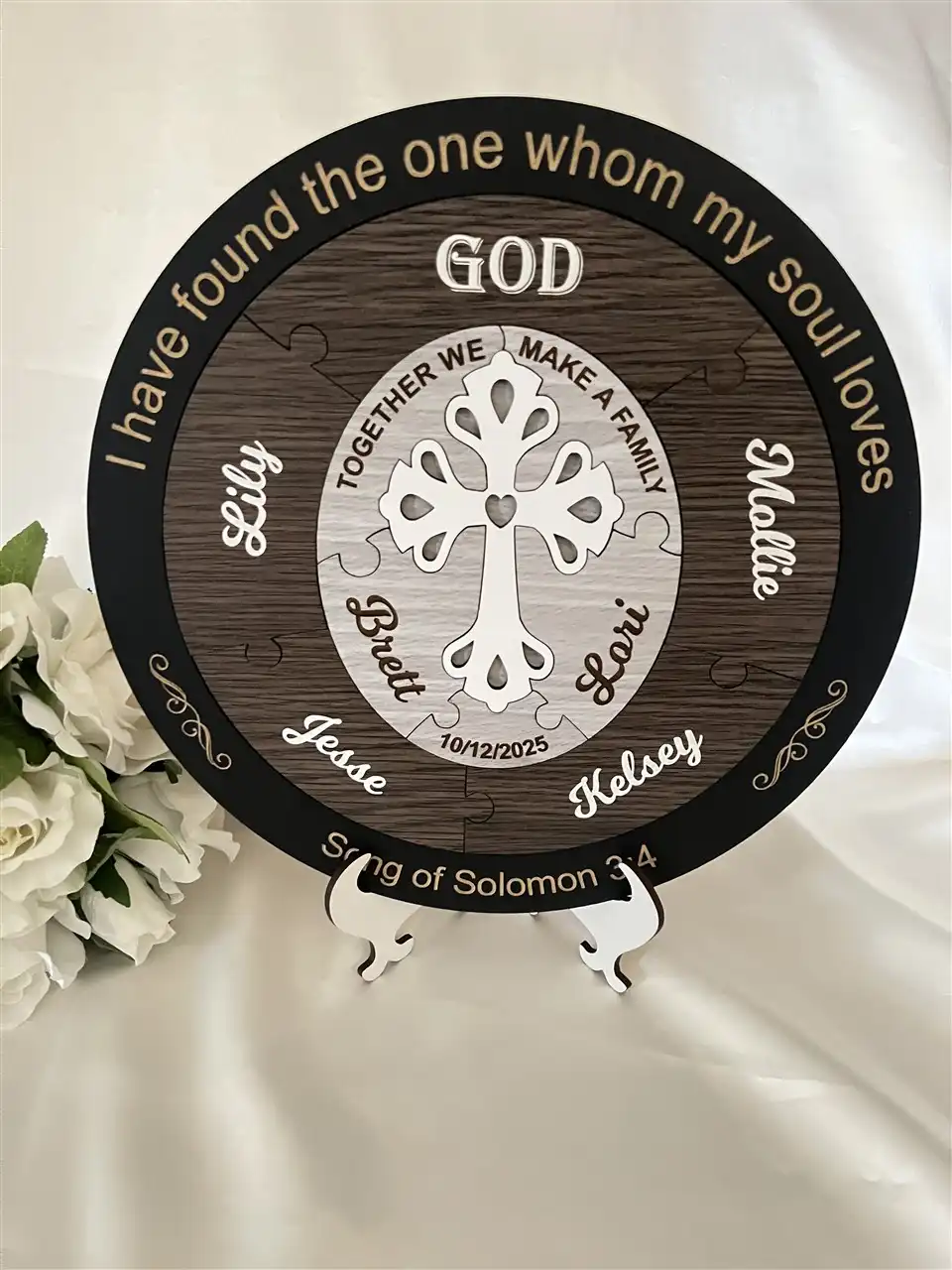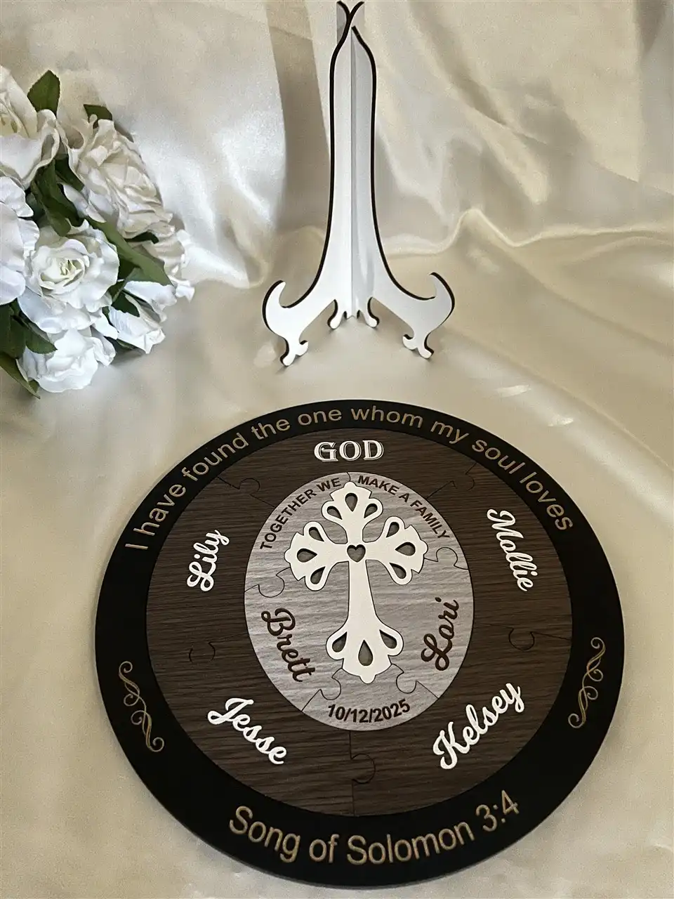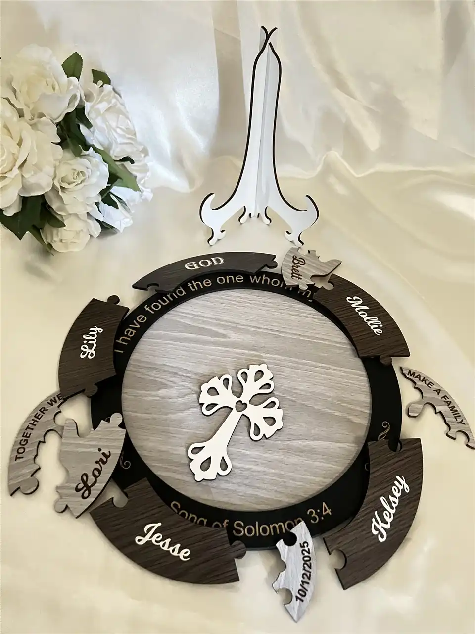Beautiful christian unity puzzle for wedding in a dark theme, every piece precision laser cut for the perfect fit.